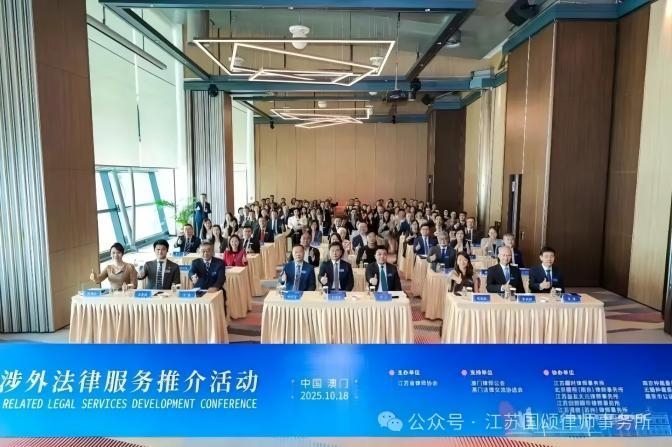 2025年10月18日,由江苏省律师协会主办、澳门律师公会及澳门法律交流协进会支持举办的“江苏省涉外法律服务推介活动”在澳门旅游塔大礼堂成功举行。本次活动是江苏涉外法律服务“走出去”的重要一环,吸引了来自江苏多家知名法律服务机构、仲裁中心、公证协会等代表参与。国颂律师事务所应邀出席本次活动,并与澳门罗马李律师事务所正式签署合作协议,共同开启苏澳法律合作新篇章。
